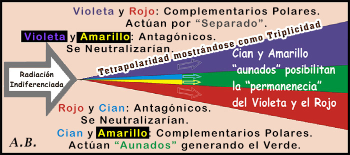 Todo en la Creación tendrá siempre una condición Tetrapolar, que se caracteriza por: dos Polaridades actuando conjuntamente, y dos Polaridades actuando diferenciadamente, cuyo ejemplo más simple lo tenemos en la refracción de la Luz --Amarillo+Cian=Verde / Rojo y Violeta-- y en las radiaciones de cuerpos radiactivos --R. Gamma / R. Alfa y Beta--), que en cierto diagrama teosófico son "Consciencia+Poder / Sujeto y Objeto".