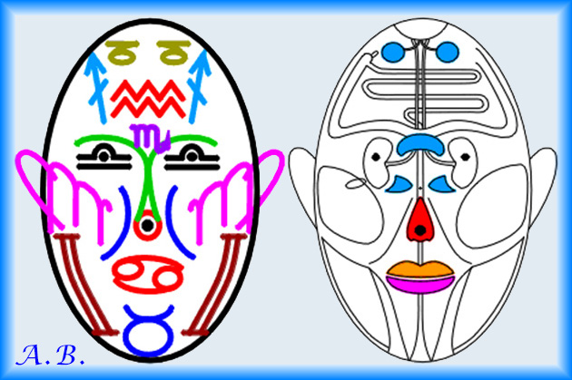 Y otro factor importante en esto de la Fisiognología, que expande o extiende bastante el criterio holográfico, es el poder conocer las influencias de lo que rodeaba a nivel astronómico (específicamente en la Eclíptica) el instante y lugar de nuestro nacimiento, donde poder observar aspectos de nuestras tendencias de comportamiento y aptitudes de la personalidad, dado que todo elemento orgánico está relacionado con valores concretos de la Personalidad (recordemos... "todo es mente"). Es lo que muestra la imagen siguiente y que define en qué áreas o elemento del Rostro se muestran tales áreas eclípticas.