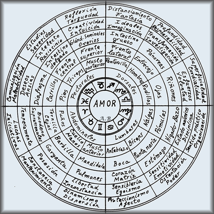 Todo está interconectado y, al mismo tiempo, expresado diferenciadamente según los patrones que utilicemos en esas correspondencias. La figura circular anterior muestra correlaciones de elementos eclípticos, elementos corporales y actitudes de la personalidad. Asuntos estos que se añaden en este texto por cuanto confirman lo holográfico de la vida material y la mental, que en definitiva vienen a ser la misma cosa pero expresadas en planos diferentes. Y sirva para esto la definición de que "el Cuerpo es la expresión orgánica o materializada de los valores mentales del individuo", que con otras palabras se diría que vienen a confirmar lo que ya se expresó de que. . . . "Todo es Mente", y que los Cuerpos son los diferentes estados de vibración de las Consciencias. Y de ahí una vez más remarcar la trascendencia de considerar al Cuerpo como la herramienta más valiosa del plano encarnado para poder conducir al Alma a su proyecto de vida en su condición humana terrenal.