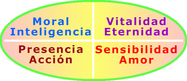 Comprenderemos la Estructura del Ser sabiendo que Todo cuanto Es tiene una Tetrapolaridad básica, a modo de Cuadratura del Círculo. Así, todo en la Creación tendrá siempre una condición Tetrapolar, que se caracteriza por: dos Polaridades actuando conjuntamente, y dos Polaridades actuando diferenciadamente, que se complementan en sí mismas, cuyo ejemplo más simple lo tenemos en la refracción de la Luz. En el caso expresado del Diagrama sobre Valores de Dios, tenemos: Sabiduría-Amor, y Eternidad-Infinitud, como Valores básicos o Esenciales considerados en Dualidades complementarias. La primera Dualidad (Sabiduría-Amor) es al mismo tiempo Esencia y Objetivo. La segunda es el Medio donde se expresa y desarrolla la primera.