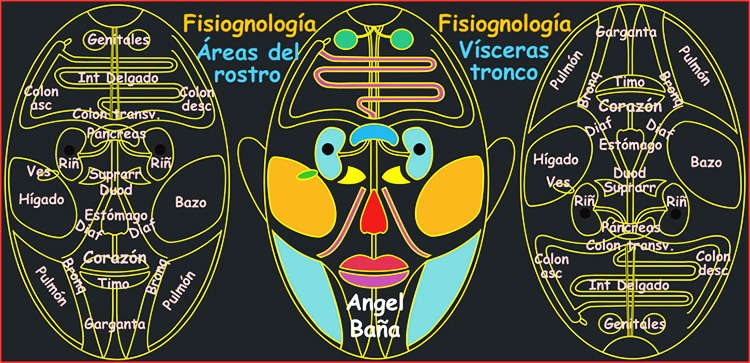 Utilizando el criterio de la Holografía que expresa que cada parte contiene información del Todo, así como en un principio de este texto se utilizaba para conocer, desde la relación de nuestra Alma con el Cuerpo, la relación de Dios con el Universo, vemos que igualmente da razón de ser a los diversos Sistemas Reflexológicos que ayudan a conocer aspectos específicos y de la globalidad interna del Cuerpo, examinando algunas áreas concretas del mismo, tales como los Pies, las Manos, las Orejas, los Iris, etc. Y sobre este asunto, se aprovecha para también aportar aquí, como apoyo al conocimiento del Cuerpo, un esquema de la Fisiognología facial aún no muy extendida, de gran utilidad para captar la condición de las diferentes Vísceras y ajustar a ella la nutrición que debamos aportarle, o saber de necesidades de atención respecto de sus estados fisiológicos. Muestra cómo en el Rostro podemos conocer de muchos aspectos de la Fisiología corporal, en una correspondencia de "inversión simétrica" respecto de la línea del Cuello.