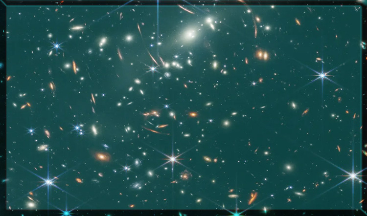 Imagen tomada por el Telescopio Espacial Hubble, mostrando pequeña fracción de galaxias del cúmulo de galaxias Abell 370, a unos 4 mil millones de años luz de la Tierra. Este es un grupo de galaxias unidas libremente por la atracción de la gravedad. Abell 370 contiene varios cientos de galaxias. En 2016, se dieron cuenta de que también debe haber muchas galaxias demasiado oscuras y distantes para aparecer en el campo profundo del Hubble, lo que significa que el número total de galaxias probablemente sea de 2 billones.