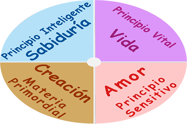 La imagen que sigue muestra cómo es la interacción de los Principios fundamentales de Dios: Desde su Vitalidad como Espíritu Puro, da lugar a la Creación, y ésta evoluciona por la intervención de sus Valores de Sabiduría del Amor.
